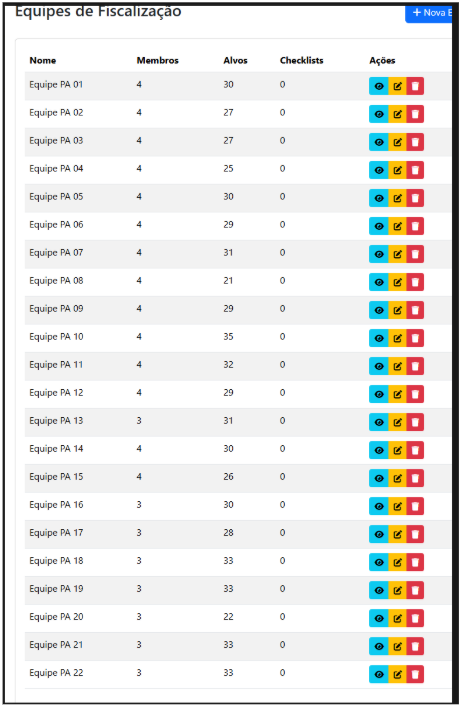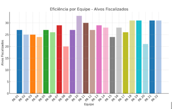 A média de alvos fiscalizados por equipe foi superior a 25 empreendimentos, com destaque para as equipes PA 10, PA 18, PA 21 e PA 22, que superaram a marca de 30 inspeções. A variação entre as equipes reflete, além da capacidade operacional, diferenças logísticas e geográficas entre os setores designados.