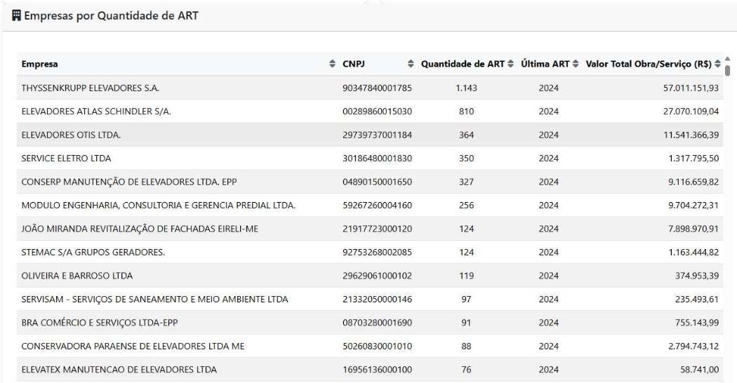 Será a primeira vez que tal monitoramento será feito pelo Confea, utilizando dados dos últimos 10 (dez) anos extraídos da base de dados nacional de ARTs. O sistema, ainda em testes, apresenta no momento os seguintes resultados: