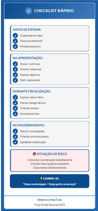 Exemplo de Aplicação Prática: Imagine o agente fiscalizador chegando à obra. Em vez de simplesmente entrar, ele segue o protocolo: Manual de Abordagem na Fiscalização do Sistema Confea/Crea, Seção 8.1