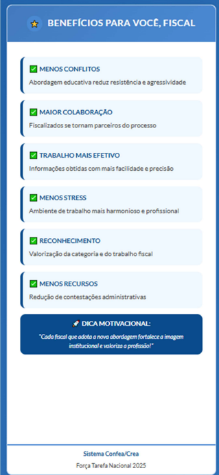 - Capacitação Contínua dos Fiscais: Manter programas de capacitação periódica para os fiscais, focando não apenas na atualização das normativas, mas também no aprimoramento das habilidades de comunicação e no reforço da abordagem consultiva e orientativa durante as inspeções.