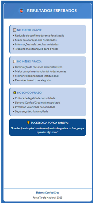 7.4. Foco na Solução: Em vez de apenas autuar, a equipe de fiscalização teve o papel de educar, esclarecer dúvidas e apresentar as soluções e caminhos para a regularização, alinhando-se aos princípios da governança colaborativa e da prevenção de problemas futuros. A Força-Tarefa atuou como um elo entre a normativa e a prática, facilitando a adequação.