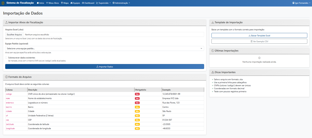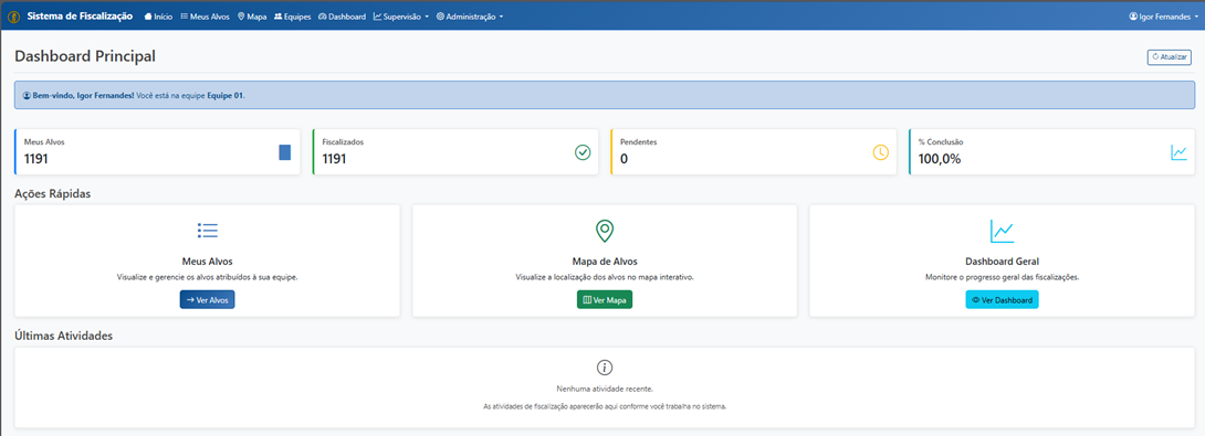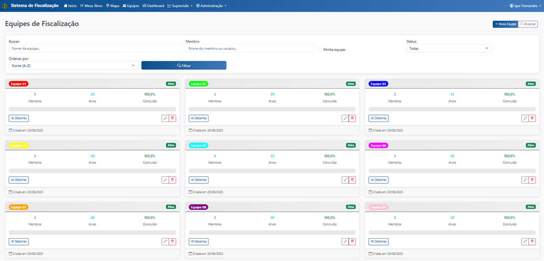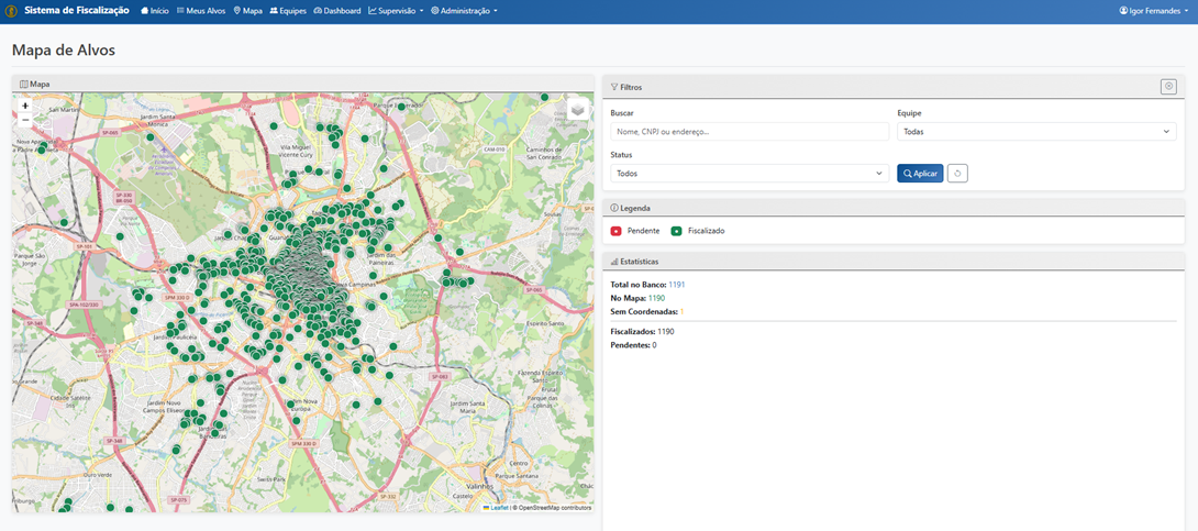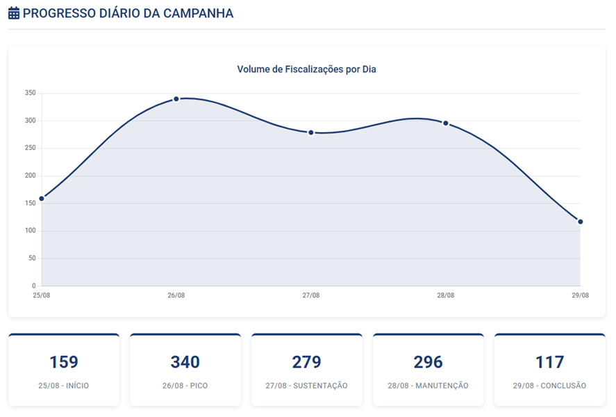 Controle de Equipes: O sistema monitorou as 40 equipes de fiscalização, cada uma com aproximadamente 3 membros. Todas as equipes concluíram 100% de seus alvos atribuídos, demonstrando a eficiência da operação coordenada.