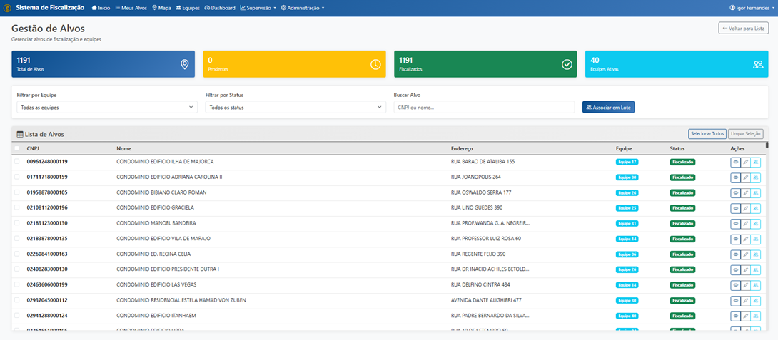 Gestão de Alvos: Cada condomínio foi catalogado com informações detalhadas incluindo CNPJ, nome, endereço e equipe responsável. O sistema possibilitou filtros por equipe e status, facilitando a localização de alvos específicos durante a operação.