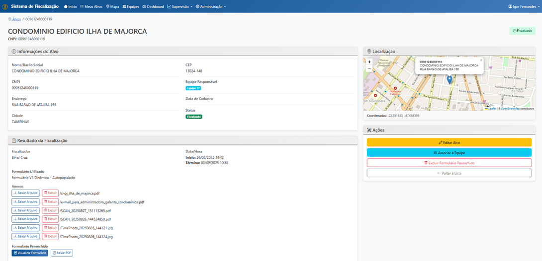 Documentação Fotográfica Integrada: O sistema permitiu upload direto de fotografias e documentos durante a fiscalização, criando evidências visuais das condições encontradas e documentos verificados.