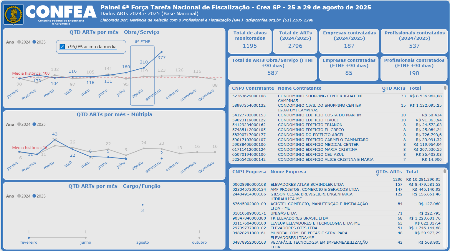 Estamos monitorando 1.195 alvos em Campinas. O sistema registrou 2.796 ARTs no período 2024/2025, envolvendo 187 empresas e 537 profissionais contratados ou que formalizaram contratos existentes, demonstrando o alcance expressivo da ação fiscalizatória.