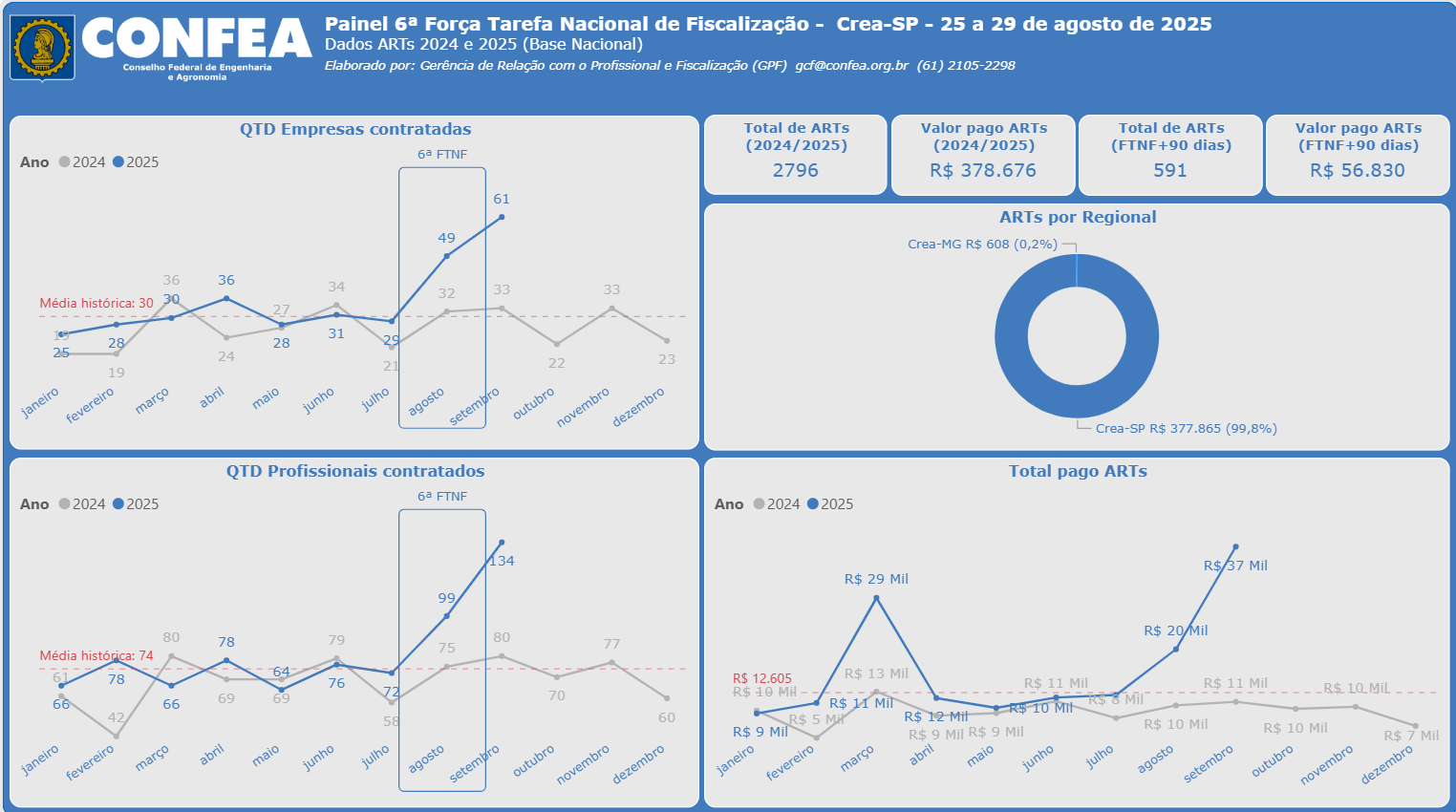 O dashboard desenvolvido pela Gerência de Relação com o Profissional e Fiscalização (GPF) do Confea revela de forma inequívoca como a 6ª Força-Tarefa Nacional de Fiscalização, realizada em agosto de 2025, provocou uma reação imediata e significativa no comportamento de regularização profissional em Campinas.