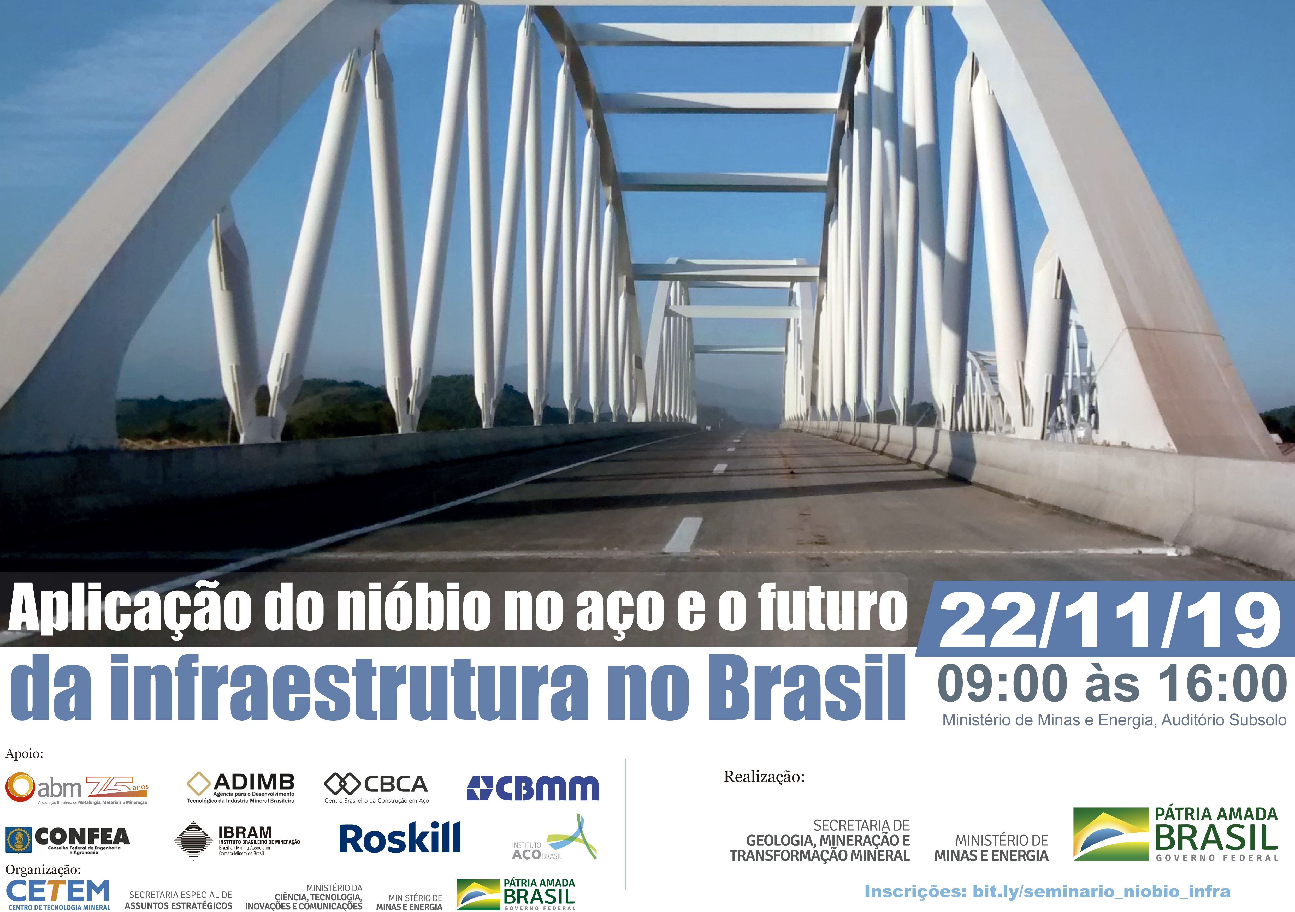 Com o objetivo de ampliar o conhecimento para o planejamento de obras de infraestrutura no país, com relação à capacidade técnica e produtiva da indústria do aço, bem como dos principais fabricantes de estruturas metálicas brasileiros, o Ministério de Minas e Energia, com apoio do Conselho Federal de Engenharia e Agronomia (Confea), promove no dia 22 de novembro, em Brasília (DF), o seminário “Aplicação do Nióbio no Aço e o Futuro da Infraestrutura no Brasil”.