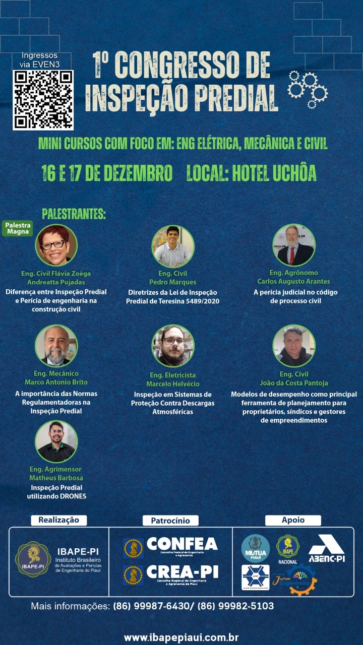 A presidente do Ibape-PI comenta que o evento está tendo uma aceitação muito boa entre os setores público e privado. “Temos três palestrantes, inclusive remotamente. Ele abrange profissionais até da área de administração de condomínios para alavancar a lei da inspeção predial para que ela não fique engavetada. A gente trabalhou bastante para a aprovação da lei. Agora, vamos partir para que os municípios maiores tenham suas leis até porque são municípios centenários que precisam ser mantidos nos três polos maiores do Estado: Picos, Parnaíba e Floriano”, informa.