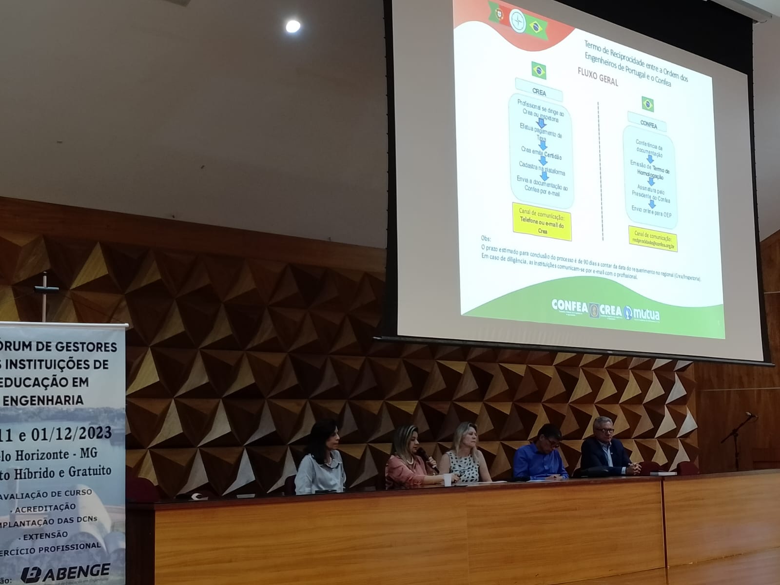 Sob coordenação da presidente da Abenge, Adriana Tonini, o assunto foi abordado pelas analistas da Gerência de Relacionamentos Institucionais do Confea Mônica Lannes e Sabrina Carpentier; pela vice-presidente da Ordem de Portugal, Lídia Santiago; Susana Teles também da OEP; e pelo vice-presidente do Crea-MG, João Magalhães.