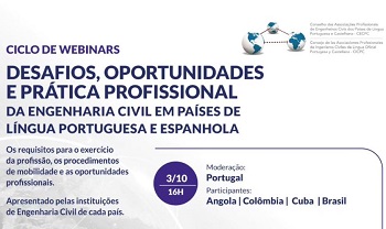 O Conselho Federal de Engenharia e Agronomia (Confea) participa, a partir de hoje, de uma série de Webinars,  promovido – semanalmente – pelo Conselho das Associações Profissionais de Engenheiros Civis dos Países de Língua Oficial Portuguesa e Castelhana (CECPC).
