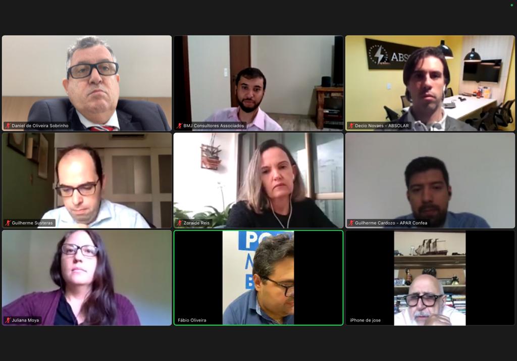 Daniel Sobrinho e o assessor parlamentar Guilherme Cardoso, juntamente com o coordenador do grupo técnico da Associação Brasileira de Energia Solar Fotovoltaica (Absolar), Guilherme Susteras; a Assessora de Relações Institucionais da Confederação Nacional de Agricultura (CNA), Zoraide Reis; a especialista em defesa do consumidor da Proteste, Juliana Moya; o assistente em Relações Governamentais da BMJ Consultores Associados, Carlos Muller; subsidiaram a bancada do Podemos sobre a relevância da instituição desse marco legal no Brasil.