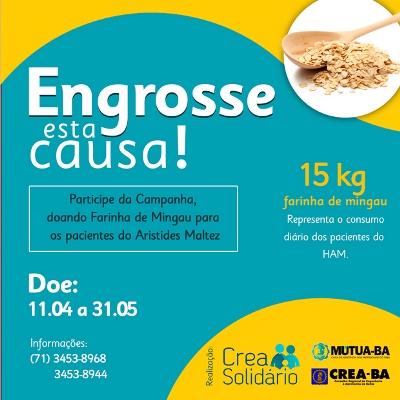 Atento as necessidades nutricionais dos pacientes do Hospital Aristides Maltez e consequentemente reforçando o seu compromisso social com a instituição, o Conselho Regional de Engenharia e Agronomia da Bahia (Crea-BA) inicia no dia 11 de abril uma campanha para arrecadar farinha de mingau. A ação vai envolver conselheiros, empresas, entidades, funcionários e profissionais registrados.