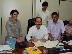 Logo depois, as autoridades participaram da assinatura para renovação do Casa Fácil. O programa, idealizado em Cascavel, está presente em Cafelândia há 18 anos. “Considerado Franus (prefeito) um dos grandes incentivadores do programa, face aos resultados expressivos alcançados no município após a implantação”, comenta Marli. Em 20 anos de programa em Cascavel, oito mil famílias já foram beneficiadas. As autoridades também receberam os 19 cadernos técnicos desenvolvidos pelo CREA-PR.