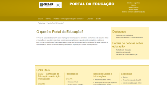 O Portal da Educação do Crea-PR reúne informações relevantes acerca do Sistema Confea/Crea e de assuntos afetos a Educação, em seus diferentes níveis, considerando o propósito de resguardar o interesse público e a ética no exercício das profissões das Engenharias, da Agronomia, das Geociências, das Tecnológicas e Técnicas, buscando a sua valorização, através da excelência na regulamentação, organização e controle destas profissões.