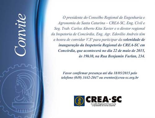 O Crea-SC realiza na próxima sexta-feira (22), a partir das 19h30, a solenidade de inauguração da sede da Inspetoria Regional de Concórdia, localizada na Rua Benjamin Furlan, 234. O evento reúne lideranças do Conselho, autoridades do município e região, representantes de entidades de classe, instituições de ensino e empresas, profissionais e colaboradores do Conselho.