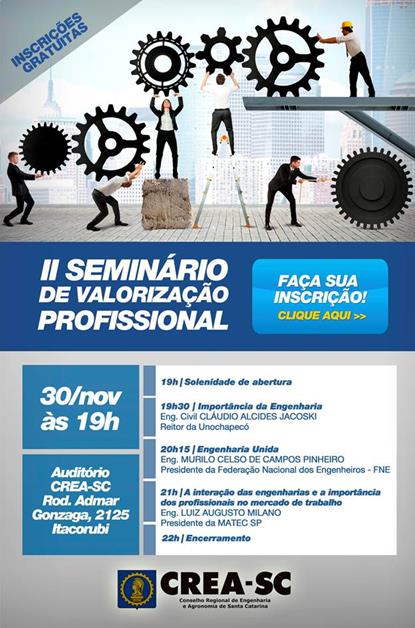 O CREA-SC promove no dia 30 de novembro o II Seminário de Valorização Profissional, no auditório do Conselho, no Bairro Itacorubi, em Florianópolis. A programação inicia às 19h e inclui palestras e debates sobre temas relevantes como: A importância da Engenharia, palestra que será ministrada pelo Eng. Civil Cláudio Alcides Jacoski, reitor da Unochapecó; Engenharia Unida, tema que será abordado pelo Eng. Civil Murilo Celso de Campos Pinheiro, presidente da Federação Nacional dos Engenheiros(FNE); e A Interação das Engenharias e a Importância dos Profissionais no Mercado de Trabalho, pelo Eng. Luiz Augusto Milano, presidente da Matec - SP.