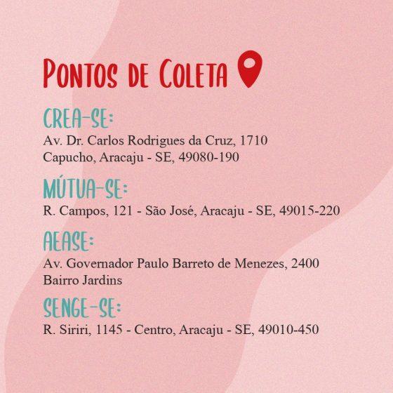 A doação de produtos pode ser feita em quatro pontos de coleta: na sede do Crea-SE, na Associação dos Engenheiros Agrônomos de Sergipe; Sindicatos dos Engenheiros Civis e Mútua.