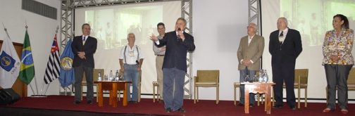 Presidente do CREA SP Eng. Civ. José Tadeu da Silva faz a abertura do Encontro de Treinamento para fiscais e atendentes, em Aguas de Lindoia - SP. Veja reportagem em vídeo ao final desta matéria.