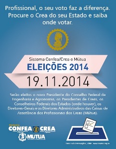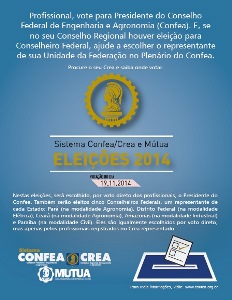 No dia 9 de outubro, o Confea distribuiu para todos os Creas e a Mútua as peças abaixo, em formato adequado para impressão. Anúncios, placas de sinalização e banners têm a função de contribuir para padronização da programação visual de divulgação das eleições: