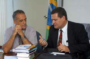 O diretor do Denatran, eng. eletricista Ailton "Da esquerda para direita: Ailton Brasiliense Pires (diretor do Denatran) e Wilson Lang (presidente do Confea) - Dalmi Rodrigues" Brasiliense Pires, e o presidente do Confea, eng. Wilson Lang, iniciaram hoje o diálogo para cooperação entre as duas instituições. Dois pontos da parceria já estão acertados: a participação do Confea na campanha preventiva para manutenção de veículos que o Denatran quer desenvolver, e nas dez audiências públicas sobre inspeção veicular que serão realizadas entre maio e junho. O diretor do Denatran ofereceu ainda ao Confea a possibilidade de realizar uma audiência pública, específica, em Brasília.