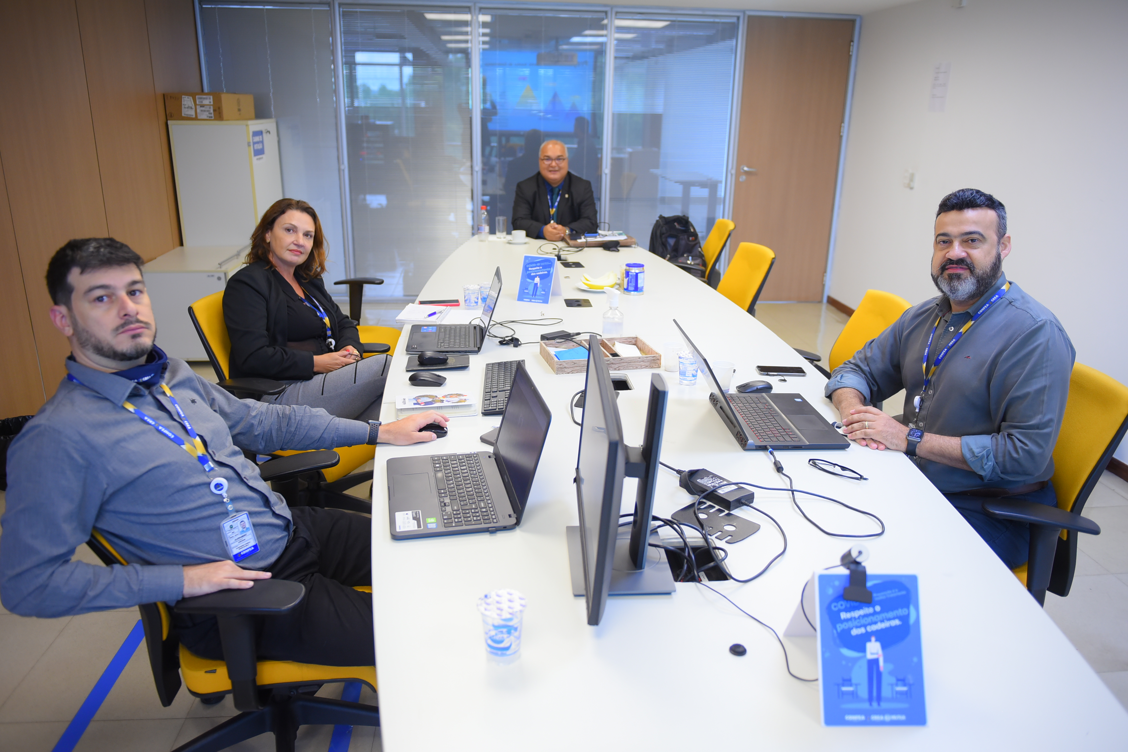 Assessores da Superintendência de Estratégia e Gestão, Alessandro Bruno e Rosãngela Simonetti, e gerente de Planejamento, Edson Mello, ao lado do diretor de Planejamento e Gestão do Confea, eng. eletric. eletron. Genilson Pavão: alinhamento