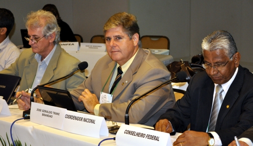 Ao centro, o Engenheiro Mecânico José Geraldo Trani Brandão, Coordenador Nacional das Câmaras Especializadas de Engenharia Industrial no ano de 2010.