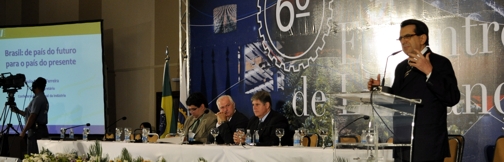 Paulo Afonso Ferreira, presidente da Federação das Indústrias de Goiás falou sobre o Brasil, de país do futuro para o país do presente. No contexto nacional e internacional, Ferreira mostrou as oportunidades e ameaças sob o ponto de vista da indústria. Na mesa diretora, à direita, Engenheiro José Geraldo Brandão, Diretor Financeiro do CREA SP e Coordenador Nacional da Câmara Especializada em engenharia Industrial.