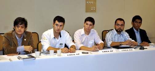Da esquerda para a direita: Thiago Gomes – CREA Jr de Minas Gerais; Leandro Matsuda – CREA JOVEM – SP; Vinicius Marchese Marinelli – Diretor Administrativo do CREA SP e um dos fundadores do CREA JOVEM SP; Felipe Mendes Silva – CREA JR do Piaui (Eleito Coordenador Nacional Adjunto); Fábio Francisco dos Santos – CREA JR da Bahia; Yuri Matos, CREA JR de Roraima (Eleito Coordenador Nacional) e Danny Fonseca – CREA JR do Amazonas.