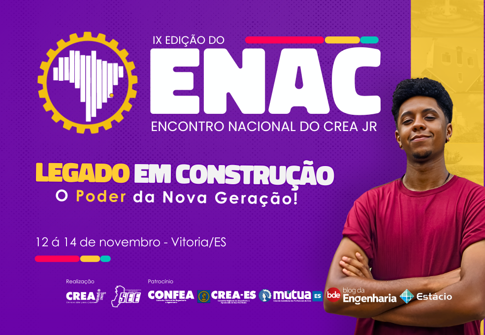O Encontro Nacional do Crea Júnior (Enac) chega à sua 9ª edição e acontecerá entre os dias 12 e 14 de novembro em Vitória, no Espírito Santo. O evento, considerado o maior encontro de estudantes das áreas tecnológicas, busca fortalecer a marca Crea Júnior e ampliar o entendimento dos participantes sobre a importância do Sistema Confea/Crea e do papel que o programa desempenha na formação profissional.