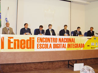 Brasília, quarta-feira, 19 de novembro de 2003. O presidente do Confea, eng. Wilson Lang, participou na manhã de hoje da abertura do I Enedi (Encontro Nacional da Escola Digital Integrada), projeto assinado pela Embrapa e UnB, destinado a inclusão digital da população que mora e trabalha na área rural. A Escola Digital Integrada é um projeto - ligado ao Fome Zero - que visa facilitar o acesso à informação através da internet e fixar o homem no campo. Terá 15 unidades implantadas em municípios do semi-árido nordestino que ainda receberão 205 mini-bibliotecas. Um programa de rádio, completa o "pacote" que pretende democratizar o acesso à informação e modernizar a agricultura familiar. Maria Helena de Carvalho - Da Equipe da ACS