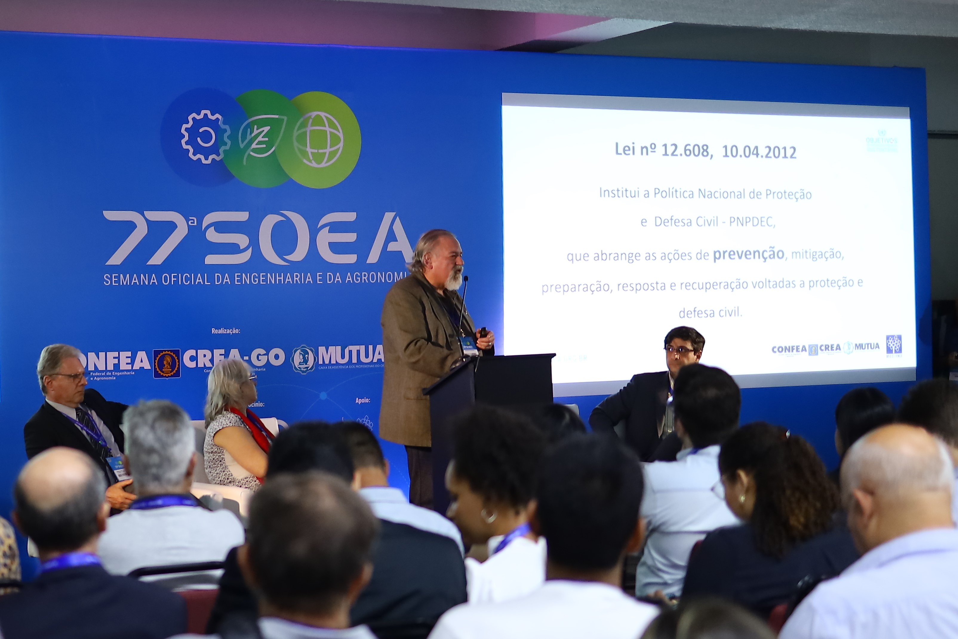 Na tarde desta terça-feira (4/10), os participantes da 77ª Semana Oficial da Engenharia e da Agronomia (Soea) lotaram a sala 1 para assistir ao painel “Desastres Naturais: a importância da prevenção e da gestão de riscos”, moderada pela geol. Marjorie Cseko Nolasco, conselheira federal suplente e professora da Universidade Estadual de Feira de Santana (UEFS), na Bahia. A primeira palestra foi sobre “Responsabilidades nos desastres naturais", ministrada pelo eng. minas Regis Wellausen Dias, presidente da Associação Brasileira de Engenheiros de Mineração (Abremi).