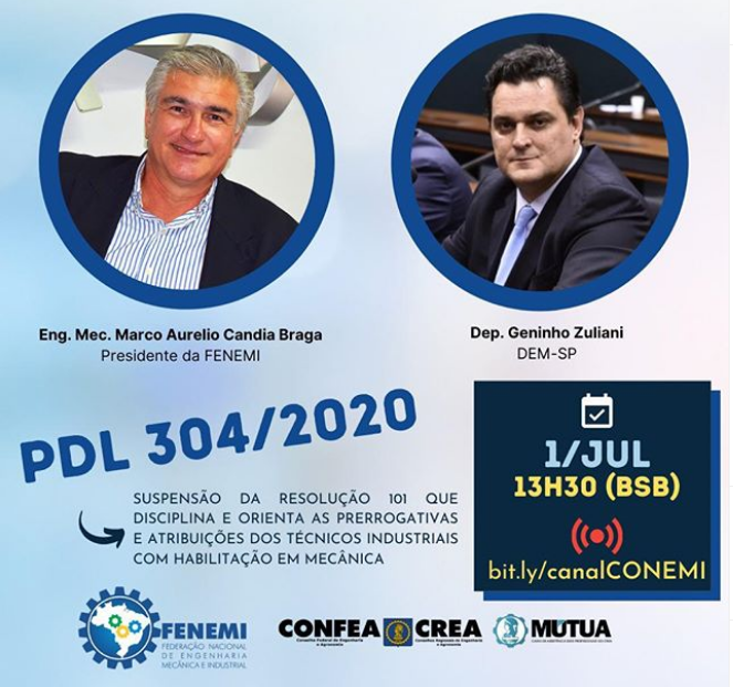 Na quarta-feira (01), o presidente da Federação Nacional de Engenharia Mecânica e Industria (Fenemi), eng. mec. Marco Aurélio Braga, debate com o deputado Geninho Zuliani (DEM-SP), o Projeto Decreto Legislativo (PDL) 304/2020, que susta a Resolução 101 do Conselho Federal dos Técnicos (CFT). O debate será transmitido pelo canal oficial do Congresso Internacional de Engenharia Mecância e Industrial (Conemi): https://bit.ly/canalCONEMI, a partir das 13:30.