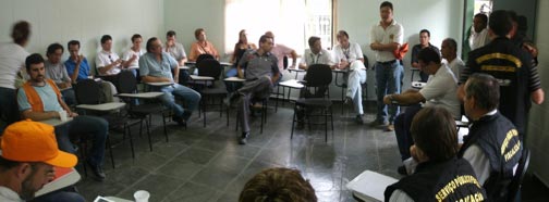 O resgate dos dois operários teve início no dia seguinte, após uma reunião (foto abaixo) entre a Defesa Civil, o Instituto de Pesquisas Tecnológicas - IPT, o Instituto Geológico - IG, o Crea-SP, o Departamento Nacional de Proteção Mineral - DNPM e os geólogos da Max Brita, empresa que explora a jazida local.