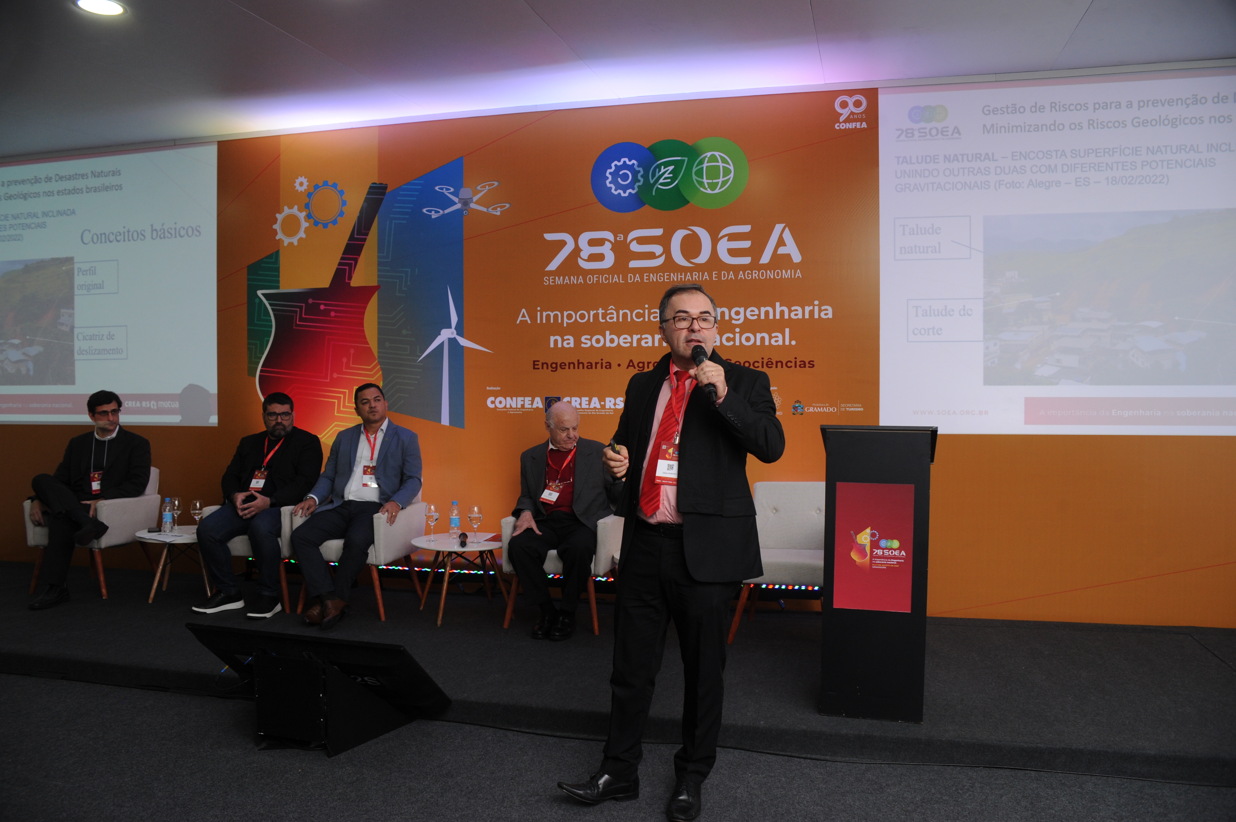 Na tarde desta quarta-feira (09), os participantes da 78ª Semana Oficial da Engenharia e da Agronomia (Soea) encheram o auditório Chimarrão para assistir ao painel “Gestão de Riscos para a Prevenção de Desastres Naturais”, moderado pelo professor da Universidade Estadual Paulista (Unesp) do campus Rio Claro, o geol. Fábio Reis. A primeira palestra trouxe o tema “Minimizando os Riscos Geológicos nos Estados Brasileiros", ministrada pelo professor da Universidade Federal do Espírito Santo (Ufes), o geol. Éder Carlos Moreira.