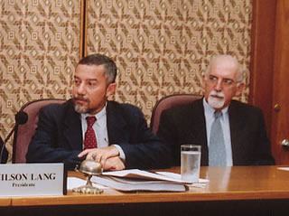 "Edaldo Gomes e Osvaldo Abib participando da última plenária de 2002 - Dalmi Rodrigues" Por iniciativa do eng. agrimensor e conselheiro federal Reinaldo Sabadatto, (Crea-MS), a plenária 1311 contou, na manhã de hoje, com a participação do cartógrafo Edaldo Gomes, do Setor de Cartografia do Incra, e do geógrafo Osvaldo Abib, consultor de geomática do instituto e responsável pela implantação do Sistema de Informações Rurais (SIR). Ambos falaram sobre a lei 10.267 que, entre outras determinações, cria o Cadastro Nacional de Imóveis Rurais (CNIR).
