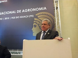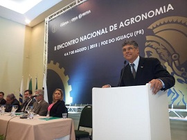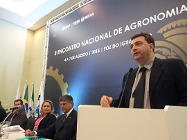 Legislação profissional foi o foco da participação de José Tadeu da Silva na abertura do II ENA. Ladeado à esquerda por Antonio Albério, integrante do Conselho Diretor do Confea, Kleber Santos, coordenador nacional das Câmaras Especializadas de Agronomia e Ângelo Peto Neto, presidente da Confederação dos Engenheiros Agrônomos do Brasil, e tendo à sua direita o vice-presidente do Crea-PR, Orley Lopes, representando o presidente do Regional, Joel Krüger, José Geraldo Baracuhy, conselheiro federal, Carminda Luzia Pinheiro, presidente do Crea do Acre, representando o Colégio de Presidentes do Sistema Confea/Crea, e ainda Luiz Antonio Luchese, presidente da Associação dos Engenheiros Agrônomos do Paraná (foto à esquerda), o presidente do Conselho Federal de Engenharia e Agronomia, José Tadeu da Silva, foi o último a falar na solenidade de abertura do II ENA.