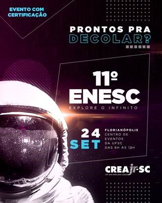 “Explore o Infinito” é o tema do 11º Encontro Estadual do CREAjr-SC (ENESC), evento que reúne cerca de mil estudantes membros e representantes de cursos e de instituições de ensino do estado vinculados ao Programa CREAjr-SC, no próximo sábado (24.09), no Centro de Eventos da UFSC, a partir das 8h.