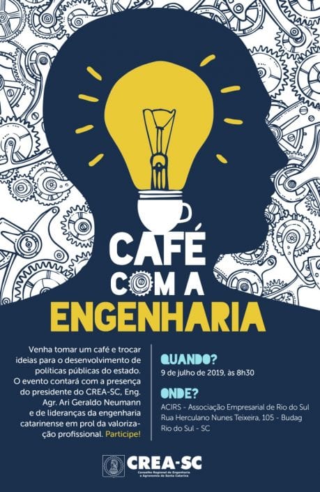 O Crea-SC realiza no dia 9 de julho na Associação Empresarial de Rio do Sul – ACIRS o Café com a Engenharia. Idealizado pela Comissão de Valorização Profissional do Conselho, o evento acontece a partir das 8h30 com o objetivo de reunir profissionais da região para debater sobre políticas públicas e trocar ideias para o desenvolvimento do estado, além de valorizar a área tecnológica e promover sua maior inserção na sociedade. Estarão recebendo os profissionais o presidente, Eng. Agr. Ari Neumann, conselheiros membros da Comissão, inspetores e diretores locais.