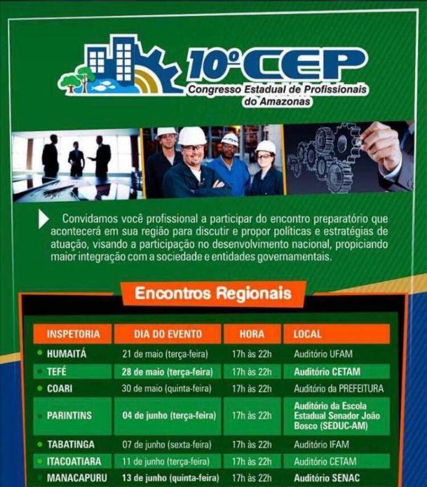 A Comissão de Organização do 10º Congresso Estadual de Profissionais (10º CEP) divulga datas e locais, das sete etapas microrregionais no interior do Amazonas. O objetivo do CEP, é discutir e propor políticas, definir estratégias e programas voltados para os profissionais e melhorias no sistema CONFEA / CREA. Durante a realização das etapas microrregionais, serão reinauguradas as inspetorias de Humaitá e Coari.