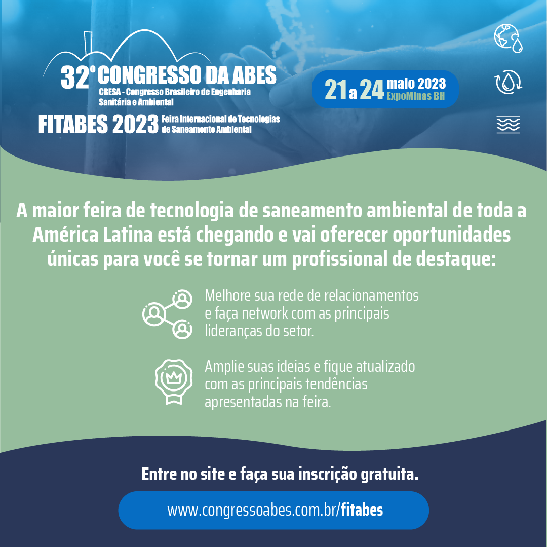 Com a realização da Associação Brasileira de Engenharia Sanitária e Ambiental (Abes) e apoio do Confea, o mais importante evento de saneamento ambiental do Brasil será promovido, de 21 a 24 de maio, no Expominas, em Belo Horizonte/MG. As inscrições estão abertas aqui: https://congressoabes.com.br/inscricoes/.