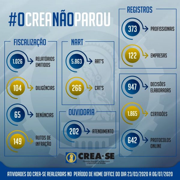 No período de 23 de março a 19 de julho, o Conselho Regional de Engenharia e Agronomia de Sergipe (Crea-SE), por meio do setor de Fiscalização realizou 117 diligências que resultaram em 160 autos de infração. O maior número de irregularidades é referente à falta de ART, documento indispensável para identificar a responsabilidade técnica pelas obras ou serviços prestados por profissionais ou empresas. Neste mesmo período foram elaborados 1.134 relatórios e registradas 76 denúncias.