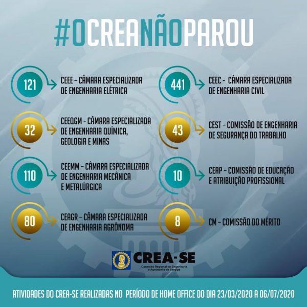 Em março, o Crea-SE adotou o sistema remoto de trabalho, quando todos os colaboradores passaram a atuar em home office. No início deste mês de julho, as atividades presenciais foram retomadas em sistema de escalonamento de pessoal. “O Crea-SE não parou um só instante. Todos os setores seguem funcionando com todos os cuidados necessários. Já na próxima segunda-feira será realizada a primeira sessão plenária por videoconferência”, informa o presidente do Crea-SE, Arício Resende Silva.
