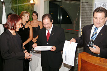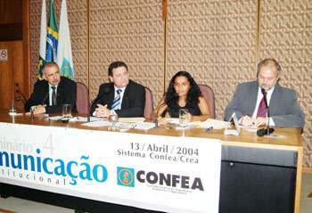 Brasília, quarta-feira, 14 de abril de 2004. A entrega dos prêmios do concurso Confea "Wilson Lang (pres. Confea)e Marcos Túlio (pres. Crea-MG) durante entrega dos prêmios" 70 Anos de Jornalismo Impresso marcou, na noite de ontem, o encerramento do IV Seminário de Comunicação Institucional realizado durante o dia na sede do Confea, em Brasília, com a participação dos assessores de imprensa do Sistema Confea/Crea.Ao abrir o seminário, o presidente do Confea, eng. Wilson Lang, destacou a importância da Comunicação Social, área responsável pela divulgação das ações do conselho.Este ano, o seminário reuniu também os assessores de imprensa dos conselhos federais da OAB (Bartolomeu Rodrigues), Medicina (Mária Wirth) e Contabilidade (Andrea Mota) o que permitiu uma estimulante troca de experiências, revelando como são enfrentadas as questões da comunicação pelos jornalistas incumbidos do desafio de informar sobre o que fazem, para que servem e o porquê da fiscalização. Ao defender que um país se faz com planejamento, Lang convidou todos os jornalistas a participar da pesquisa prospectiva de cenários para o Brasil, o mesmo proposto aos prefeitos durante o IX Congresso Brasileiro de Municípios.Na solenidade de encerramento, logo após a entrega dos prêmios o presidente Lang afirmou que não existe país desenvolvido sem que seja valorizada a área tecnológica e prestigiado quem detém o conhecimento. "Abertura do 4º Seminário de Comunicação Institucional"Maria Helena de Carvalho - Da Assessoria de Comunicação