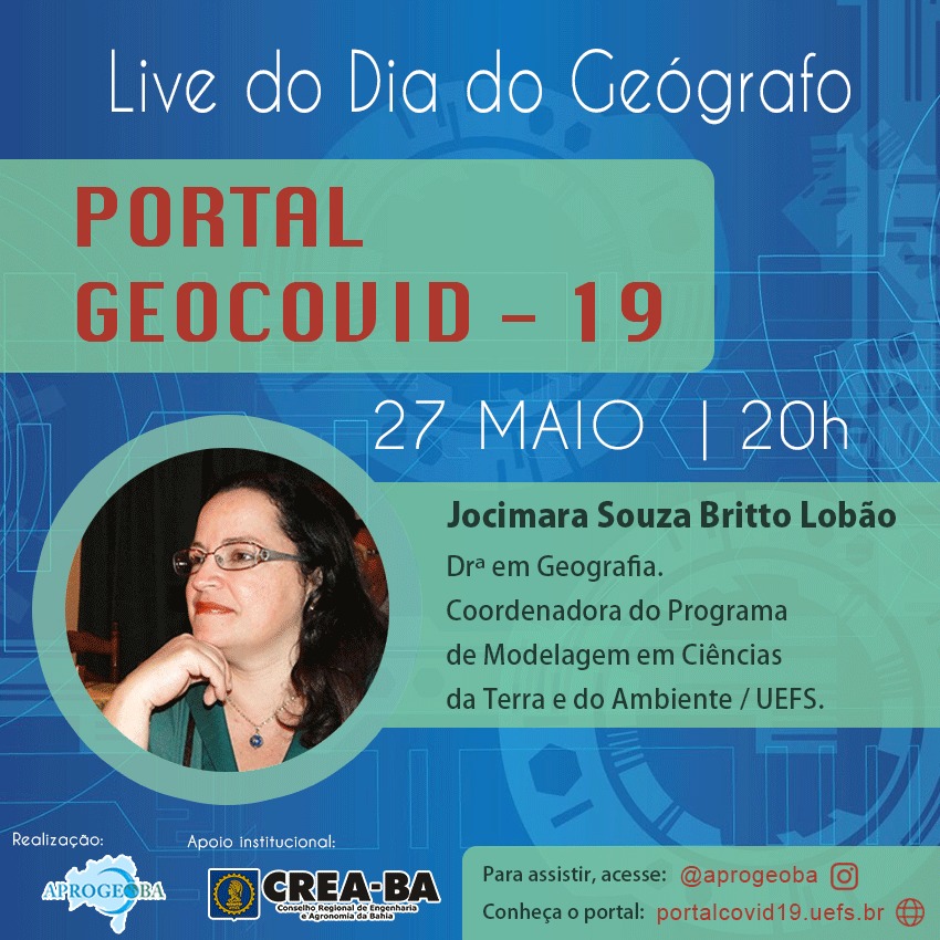 Para comemorar o Dia do Geógrafo, lembrado em 29 de maio, a Associação Profissional dos Geógrafos da Bahia (Aprogeo) promove nesta quarta-feira (27), às 18 horas, a live Portal Geocovid-19, que será conduzida pela doutora em Geografia, Jocimara Souza Brito Lobão, coordenadora do programa de modelagem em ciências da terra e do ambiente da Universidade Estadual de Feira de Santana (UEFS). O evento conta com o apoio institucional do Conselho Regional de Engenharia e Agronomia da Bahia e será transmitido pelos canal da Aprogeo no Instagram, @aprogeoba.