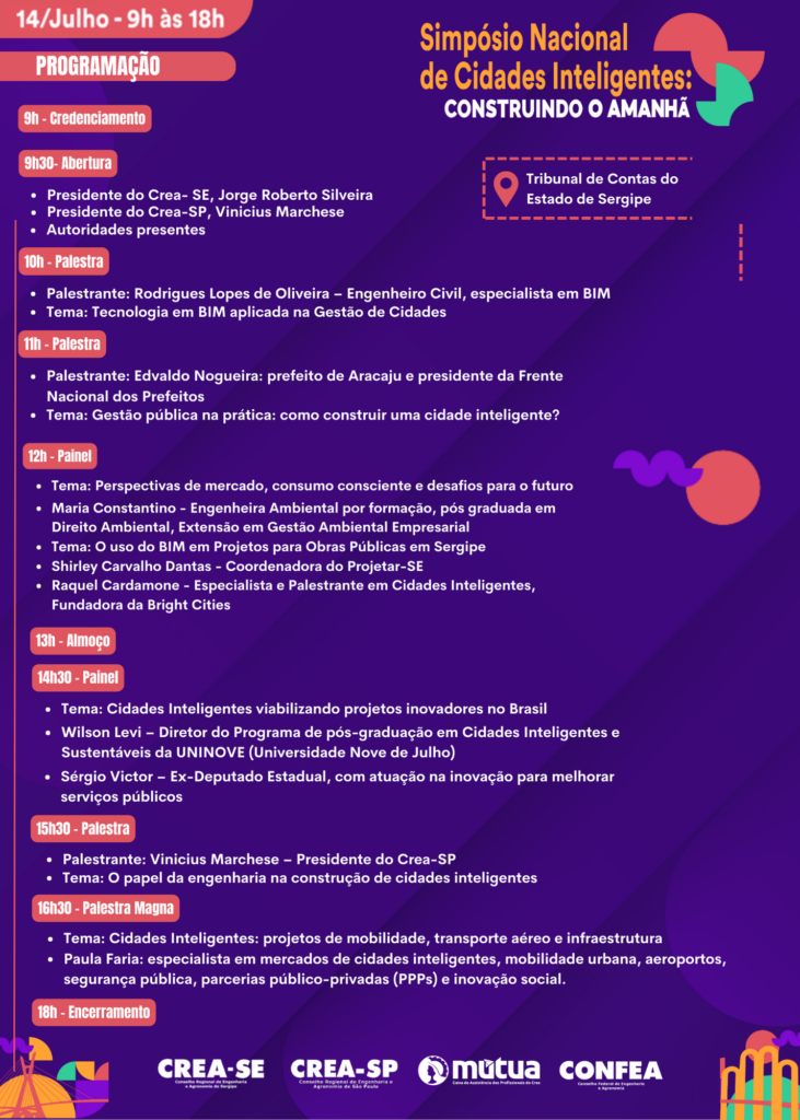 No dia 14 de julho, Aracaju se tornará palco do Simpósio Nacional Cidades Inteligentes, construindo o amanhã, evento promovido pelo Conselho Regional de Engenharia e Agronomia de Sergipe (Crea-SE) em parceria com o Crea-SP e apoio do Tribunal de Contas de Sergipe. O Simpósio reunirá prefeitos, especialistas, profissionais e gestores públicos em uma iniciativa de grande importância para o desenvolvimento das cidades. O evento será no auditório do TCE à partir das 9horas.