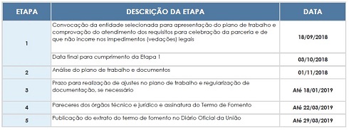 A Gerente de Desenvolvimento Institucional do Confea, Polyanna Motta Zeller, informa que o prazo final para execução das parcerias passa a ser 31 de outubro de 2019. Ela acrescenta que   os itens 8.4.1 e 8.4.2, que tratam especificamente das diligências, passam a ter a seguinte redação: