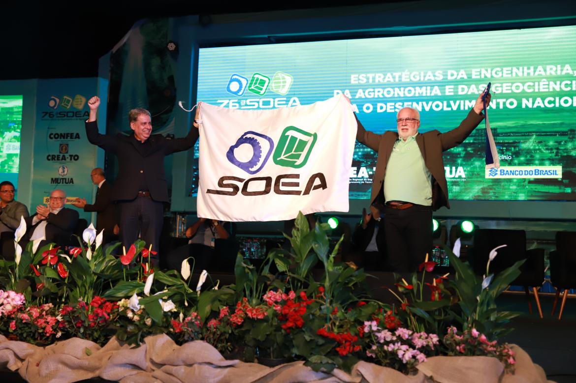 Em seguida, o presidente do regional tocantinense também demonstrou gratidão a todos que se envolveram na organização e realização da maior agenda do Sistema. Destacou que o sonho da capital mais nova do país de sediar a Semana Oficial da Engenharia e da Agronomia se concretizou. “Foi desafiador, mas gratificante. Tivemos um evento grandioso”. Antes de entregar a bandeira da Soea para o próximo anfitrião do evento – tradição nas solenidades de encerramento das Semanas Oficiais -, Maia estendeu um abraço fraternal e desejou um bom retorno aos participantes, e sucesso ao Crea-GO como sede da próxima edição.