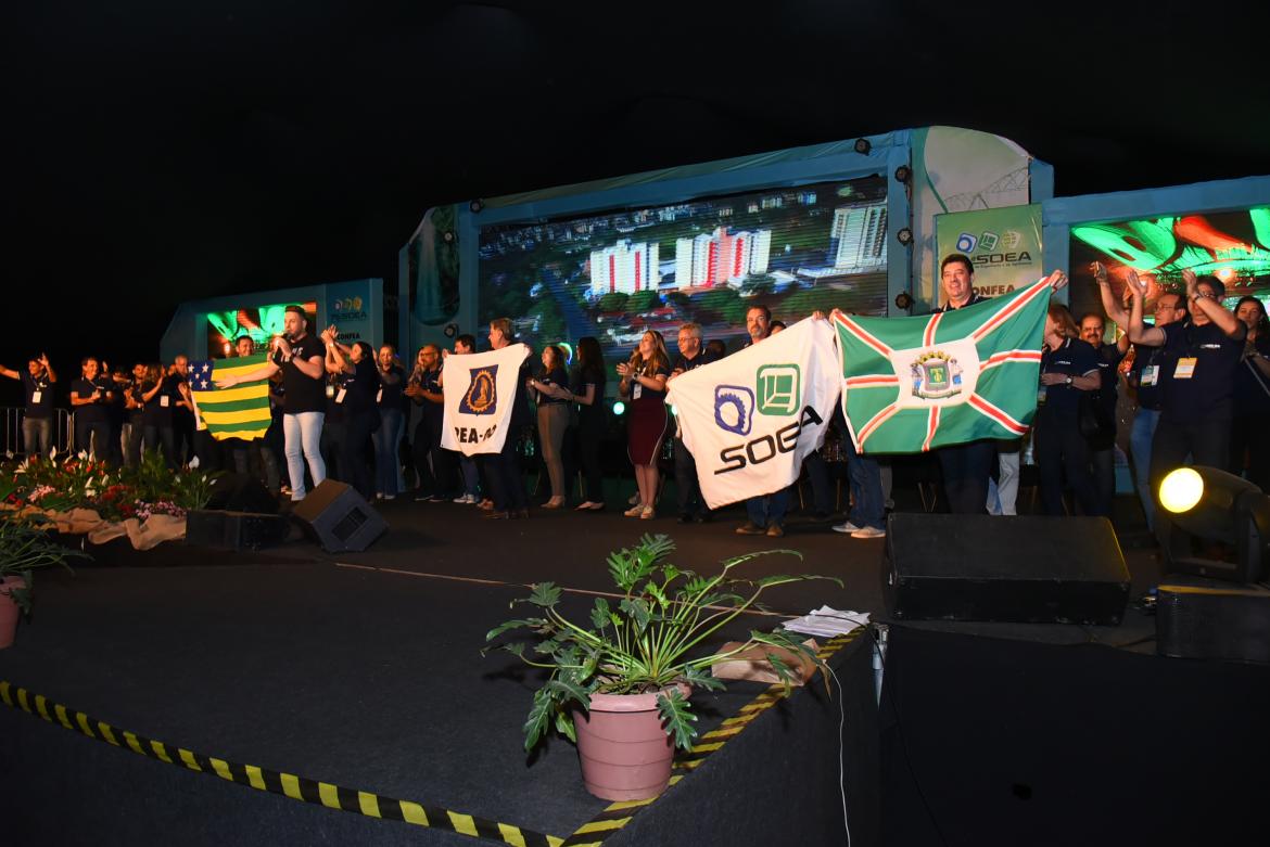Ao som de “Goiás é mais”, composição de Moacyr Franco, interpretada pelo cantor Rodrigo Arantes, a delegação goiana tomou conta do palco de encerramento da 76ª Soea, em festa, exibindo a recém-recebida bandeira da Soea, além das bandeiras do Crea-GO, do estado de Goiás e de Goiânia, a capital do coração do Brasil. “Fazer uma Soea não é fácil”, reconheceu o presidente do Conselho goiano, eng. agr. Francisco Almeida, parabenizando o presidente do Regional tocantinense pelo trabalho realizado.