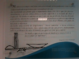 Ao tirar as fotos necessárias para redação da entrevista com o presidente do Crea-MS (Conselho Regional de Engenharia, Arquitetura e Agronomia do Estado de Mato Grosso do Sul), o engenheiro civil Jary de Carvalho e Castro, noto, no balcão ao fundo de sua mesa, uma foto dele com o arquiteto Oscar Niemeyer. “Foi em outubro de 2009”, informa a assessora de comunicação. Curioso para saber mais informações, soube de uma placa, instalada dentro do prédio, que grava algumas palavras do profissional mais importante dentro da arquitetura e urbanismo nacional destinadas com exclusividade ao conselho. A citação é a seguinte: