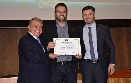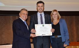 "Presidente José Tadeu, do Confea, e presidente Vinicius Marchese, Crea-SP, entregam certificado de serviços relevantes à nação ao diretor de Educação do Conselho, Eng. Quim. José Guilherme Pascoal de Souza"